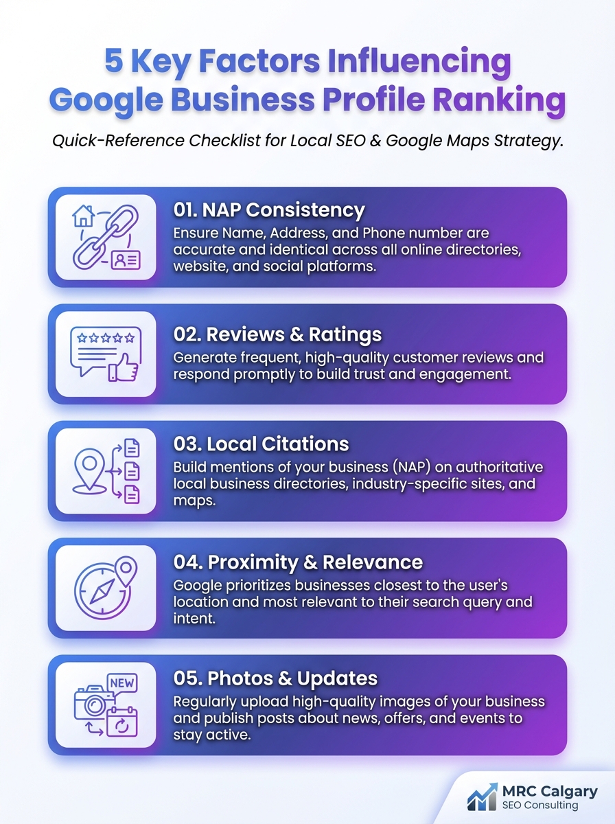 How do I improve my Google Business Profile ranking in Calgary?Start with a complete, accurate profile, strong categories, and consistent contact details, then build reviews and local activity. If you want professional help, our team at MRC SEO Consulting specializes in local visibility for Calgary businesses.