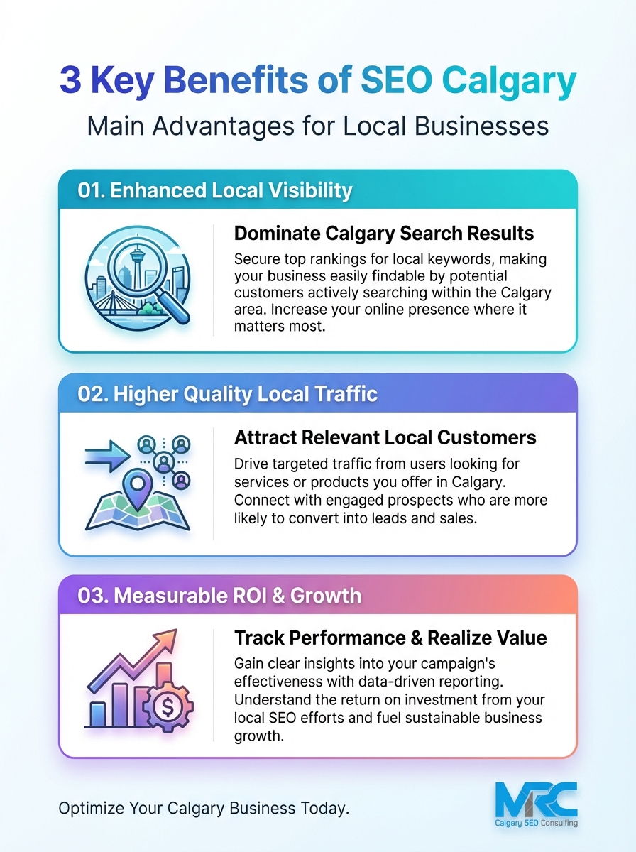 This infographic outlines three key benefits of SEO Calgary. Learn how optimizing for local search can boost visibility and traffic.